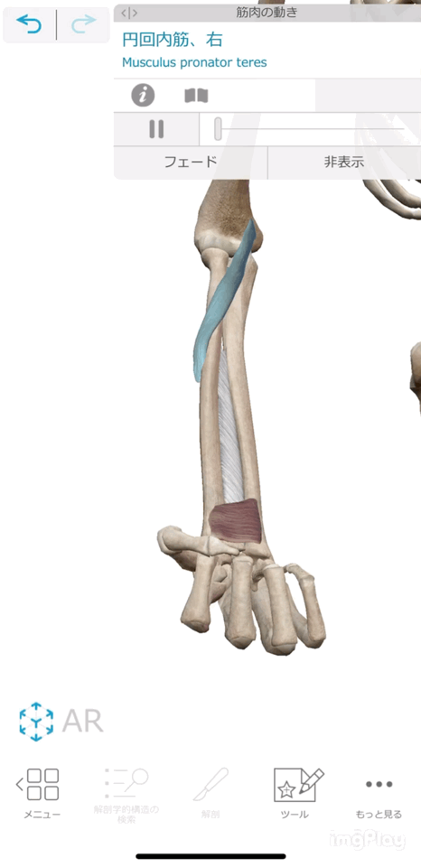 前腕を回内、つまり内側のマレットを使う時、筋肉はこんな動き。